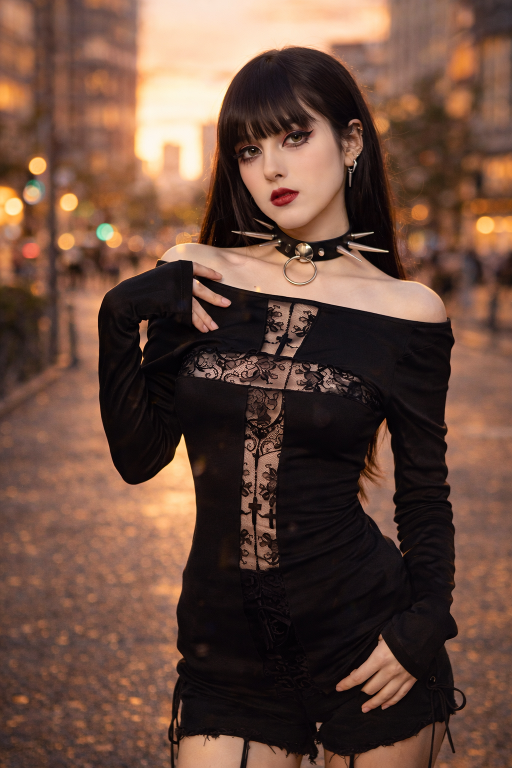 El cuello redondo clásico enmarca el diseño, mientras que los detalles en encaje y el patrón de retazos aportan textura, profundidad y una impronta artesanal que distingue a la prenda del resto. Cada elemento está pensado para reforzar una estética gótica moderna, urbana y refinada.