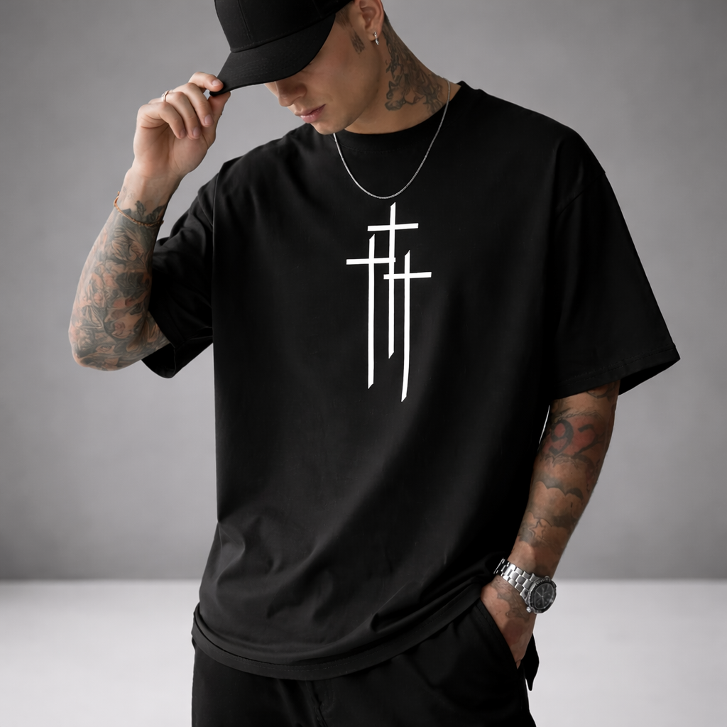 Camiseta urbana con diseño de cruz minimalista vertical, pensada para quienes buscan un estilo fuerte, limpio y con identidad. Su corte relajado y tejido ligero la convierten en una prenda ideal para el día a día, combinando comodidad y presencia en una sola pieza.